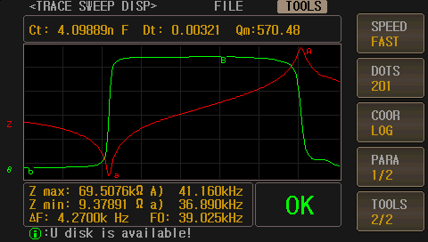 諧振頻率Fs | 反諧振頻率Fp | 靜態(tài)電容C0 | 動(dòng)態(tài)阻抗R1 |
